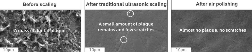 Duritatea pulberii este mult mai mica decat cea a smaltului dintilor, astfel incat tratamentul de detartraj poate proteja mai bine dintii, evitand deteriorarea suprafetei dintilor cauzate de suprarazuirea traditionala si facand tratamentul mai durabil pentru pacienti. Pudra utilizata este atat pentru tratamentul supragingival, cat si pentru cel subgingival.